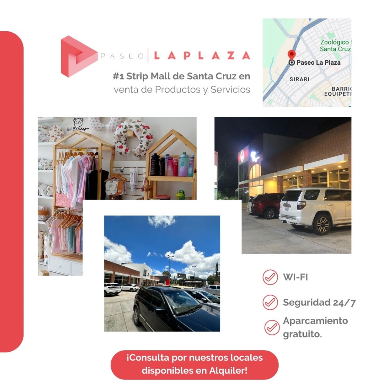 SUMATE al PRIMER STRIP MALL de Compras y Servicios de la Ciudad de Santa Cruz de la Sierra. Un triangulo de 24 Locales en linea. Estacionamiento Exclusivo con 52 lugares para tus clientes. Seguridad 24 hs. Ingreso directo con tu vehículo por el 4° Anillo.