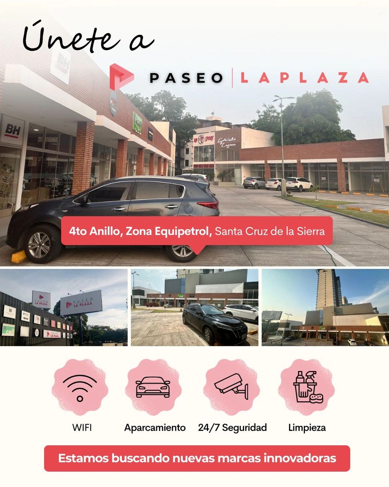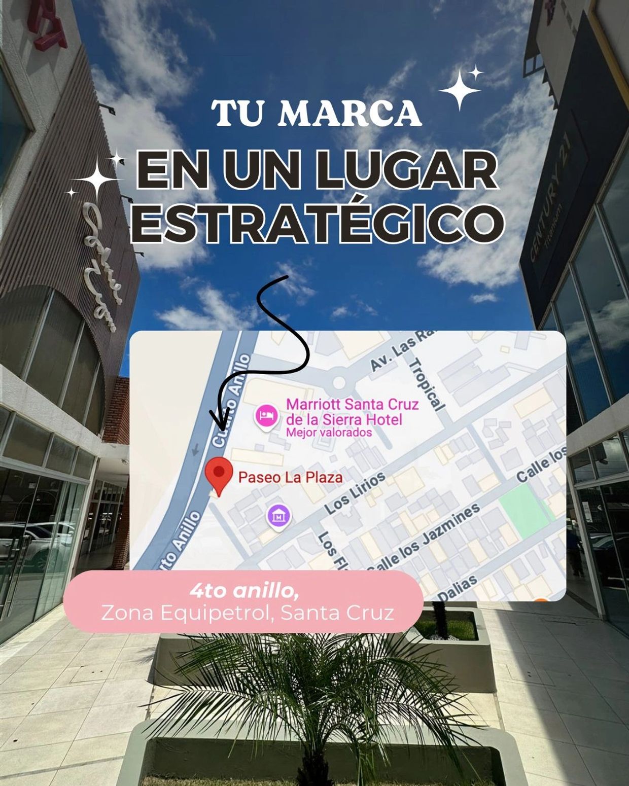 Paseo La Plaza esta ubicado en una de las mejores zonas de Santa Cruz de la Sierra. Nuestra dirección: Equipetrol Norte, 4 Anillo, junto al Marriott Hotel. Locales disponibles en Alquiler. SUMATE. Contáctanos!